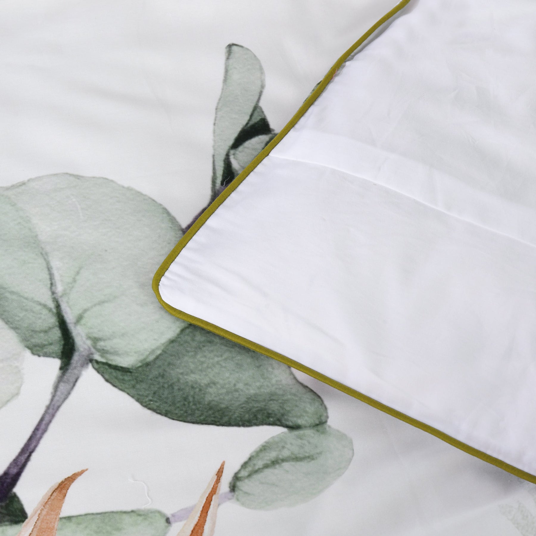 Regular price $179.00 Sale price $129.00 Save 28%Breathe fresh style into your summer bedroom with this on-trend quilt cover. Featuring a beautiful floral design and printed on smooth cotton sateen fabric. Finished with a chic green piped edge, it’s where comfort meets seasonal flair.