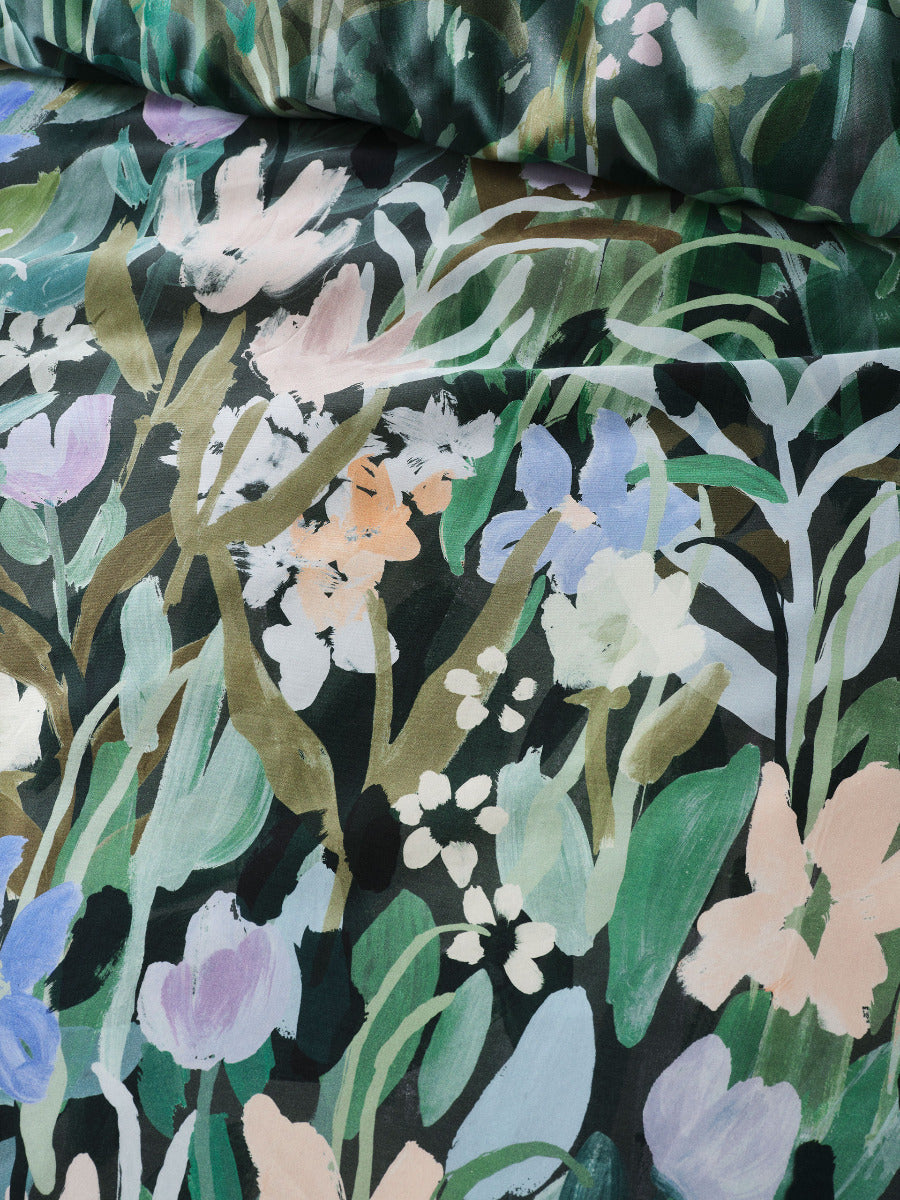 This luxe cotton sateen floral reverses to a plain-dyed hue, and looks ravishing adorned with its coordinating European pillowcases.