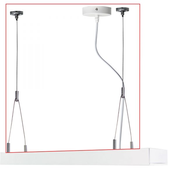 Convenient kit enables our VANA.LED ceiling light to be suspended. Suitable for use over benches, tables or areas where the ceiling is high. The power-supply canopy and cable is white; suspension wires are stainless steel and the ceiling mounts are chrome.