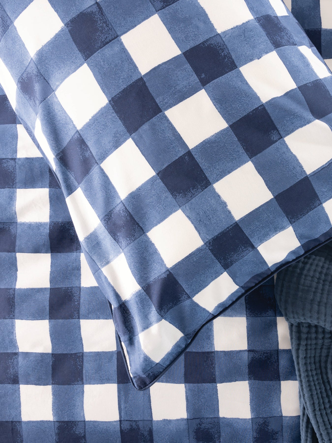 Turn your bedroom into a cosy retreat with this watercolour check print, in a contrmporary combination of tonal navy and white. Versatile and stylish, Georgie is printed on cotton percale and is finished with piping. This set is complemented by a simple geometric print on the reverse.
