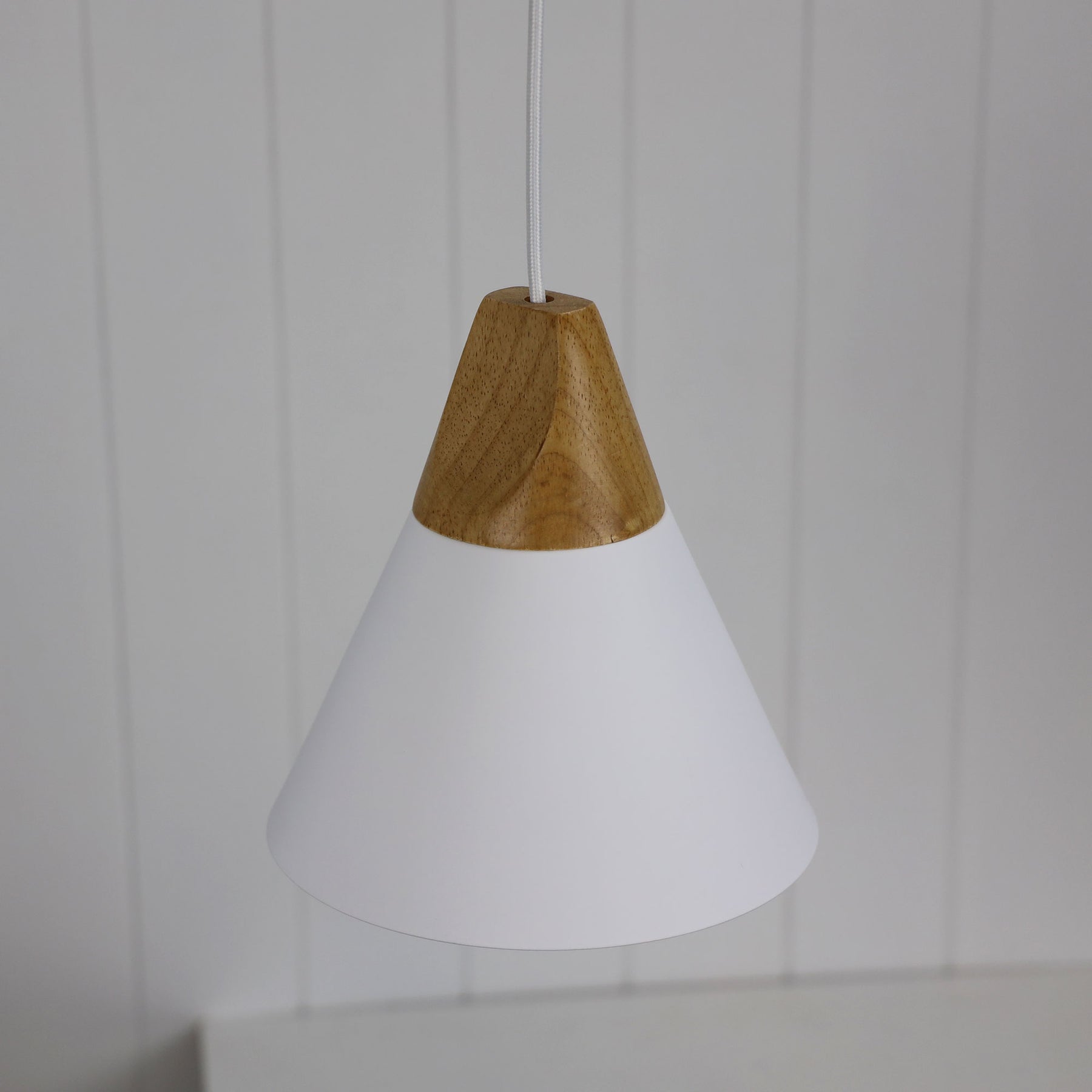 Regular price $159.00 Sale price $139.00 Save 13%The designer styling of the Trigo includes matt finish paint, sculptured timber block on top of the conical shade and cloth covered cord suspension.