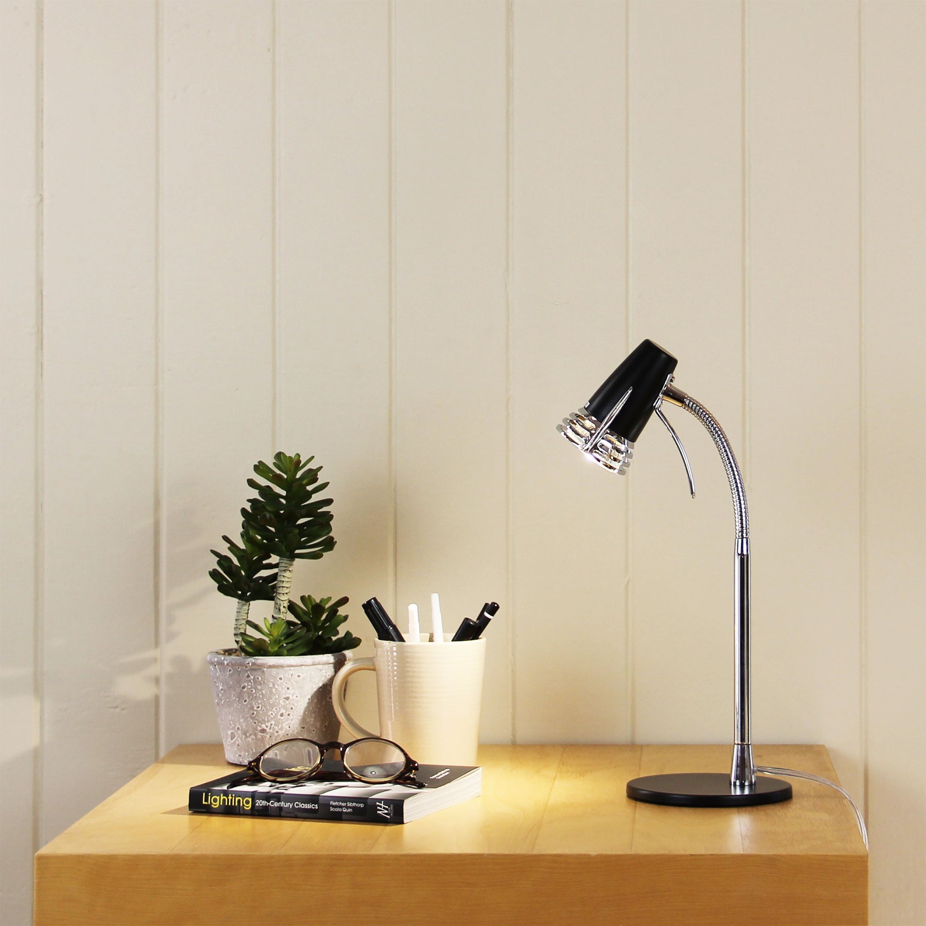 Regular price $109.00 Sale price $89.00 Save 18%The SCOOT desk lamp has an adjustable neck, providing excellent directional lighting, without taking up too much space on your desk or bedside. Switch is located conveniently on the cord. The SCOOT is complete with a cool and energy saving LED globe. Available in a choice of four colour finishes, all with chrome rod and features.