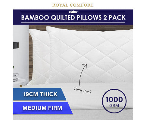 Royal Comfort Luxury Bamboo Blend Quilted Pillow Twin Pack Extra Fill Support White 50 x 75cm Royal Comfort