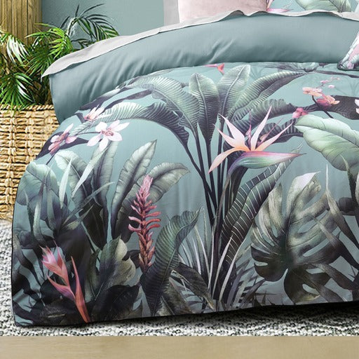 Regular price $139.00 Sale price $113.05 Save 19%Bring those tropical vibes into your bedroom with Mika. Stunning florals in pink and green are scattered all over the bed. Printed on soft cotton sateen fabric and finished with beautiful piped edging. Complete the look with the addition of the luxurious velvet european pillowcases in blush.