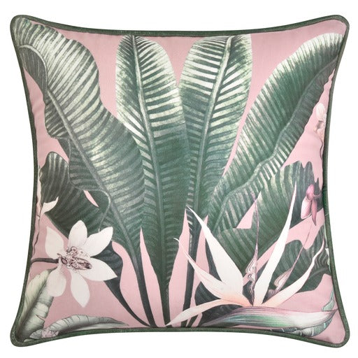 A botanical cushion set on a pink background, the Mika cushion will complement your sofa or bedroom setting.