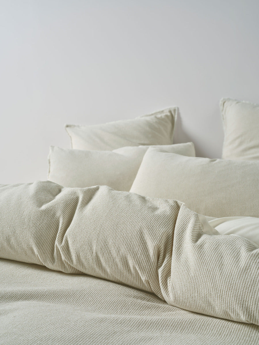 This versatile ensemble in artichoke-green offers a contemporary, easy-living vibe that's even more inviting styled with matching European pillowcases.
