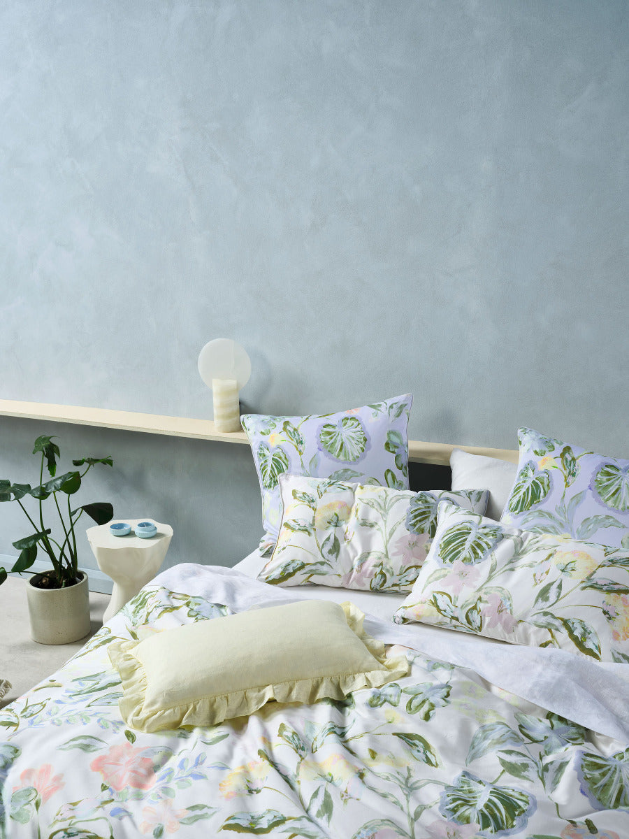 Complete with a luxe cotton sateen construction and a delightful palette of olive, coral, sky, and custard, this floral ensemble is trimmed with cord piping, and looks superb styled with matching European pillowcases.