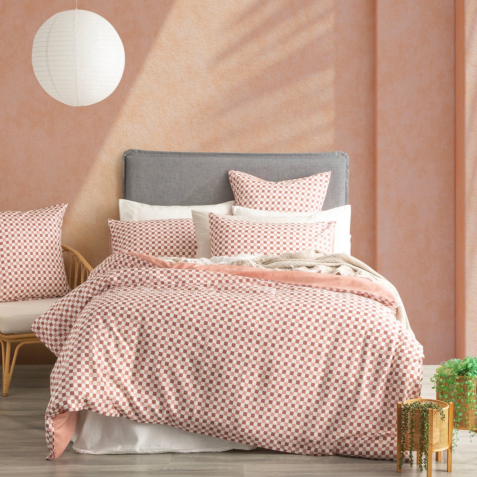Add a contemporary touch to the centre of your suite with this lovely Chessboard Quilt cover set. Simple yet sophisticated, this checkered design will update your bedroom without overwhelming your ensemble. Our quilt cover with this classic, bold plaid pattern can be your addition to your home with any style. Printed on 300 thread count cotton sateen and complemented by a beautiful matching Chambray print reverse. Complete the look with the matching European Pillowcases.